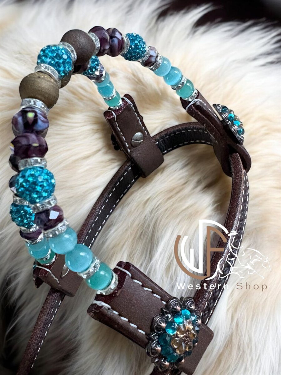 2605 Double Ear Brown – Ear loops & buckle set and conchos Aqua